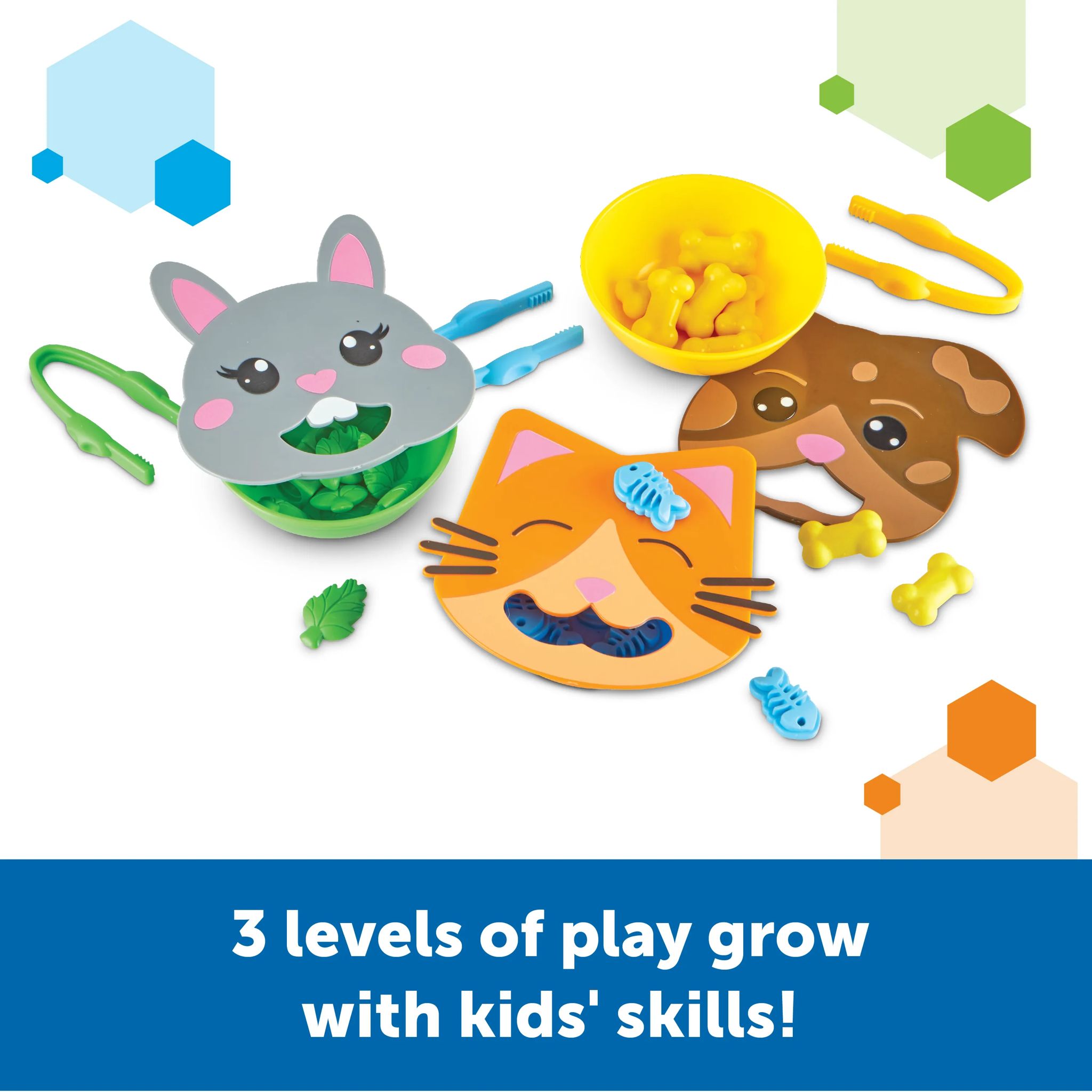 החיות המחמד החמודות האלה רעבות לפיתוח מוטוריקה עדינה! ילדים משתמשים במלקחיים מיוחדים לפיתוח מוטוריקה עדינה כדי לאסוף כל פיסת אוכל אהובה של חיית המחמד ולהכניס אותה לפה. יש עלים לארנבת, דגים לחתול, חטיף בצורת עצם לגור. עם 3 רמות קושי, ערכה מהנה זו תאתגר את הילדים, ותסייע להם ללמוד ולבנות מיומנויות חדשות בכיתה או בבית.